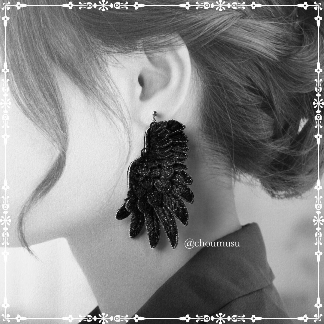 【秋のカラスとハト祭り】立体刺繍/鳥の羽根*翼イヤリング/ピアス(ハシブトガラス)