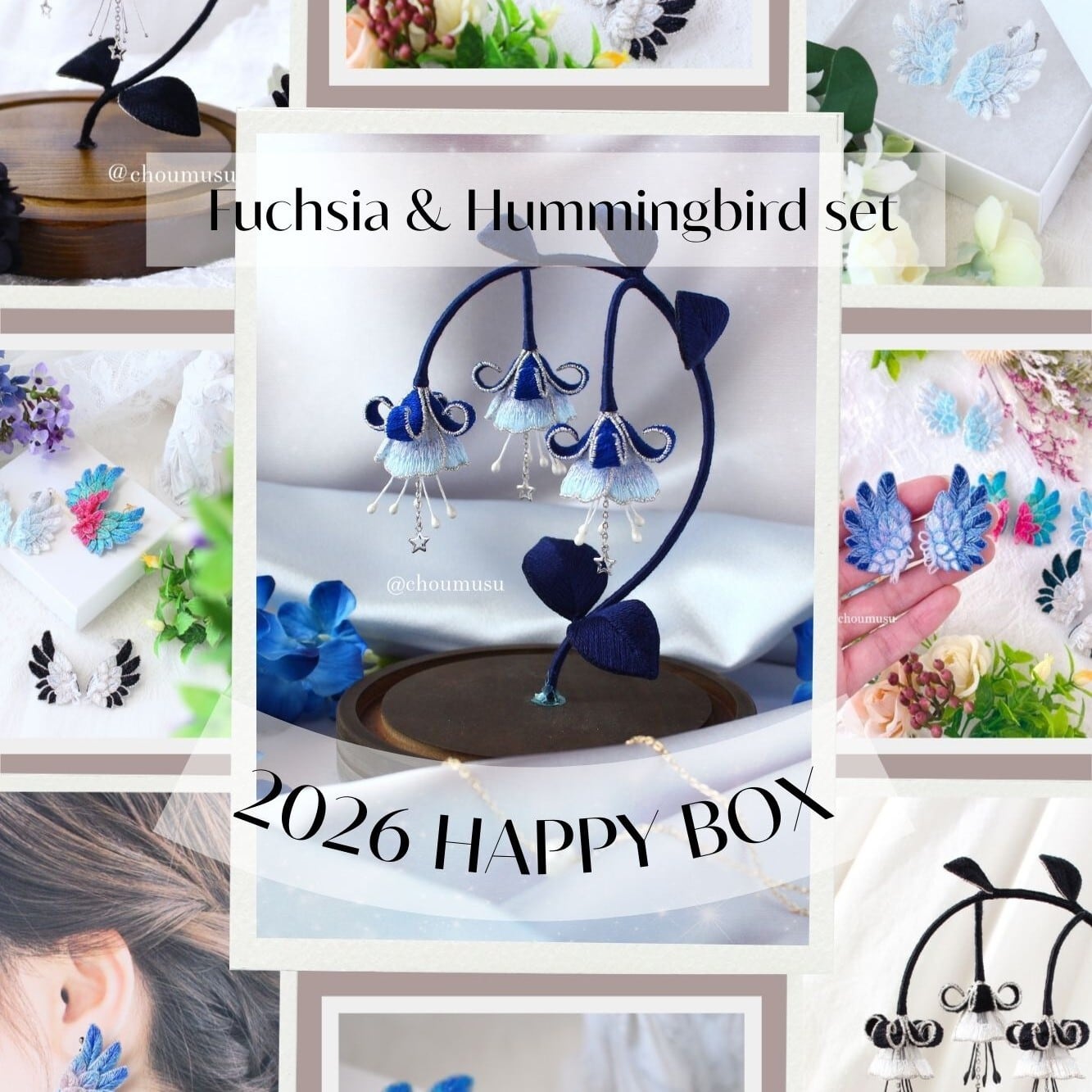 ハチドリを呼び寄せるフクシアと、フクシアの花の蜜を求めて飛んでくるハチドリの刺繍オブジェ&イヤリング/ピアスのお得なHAPPYBOXが出来ました!