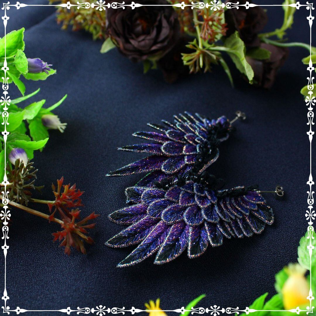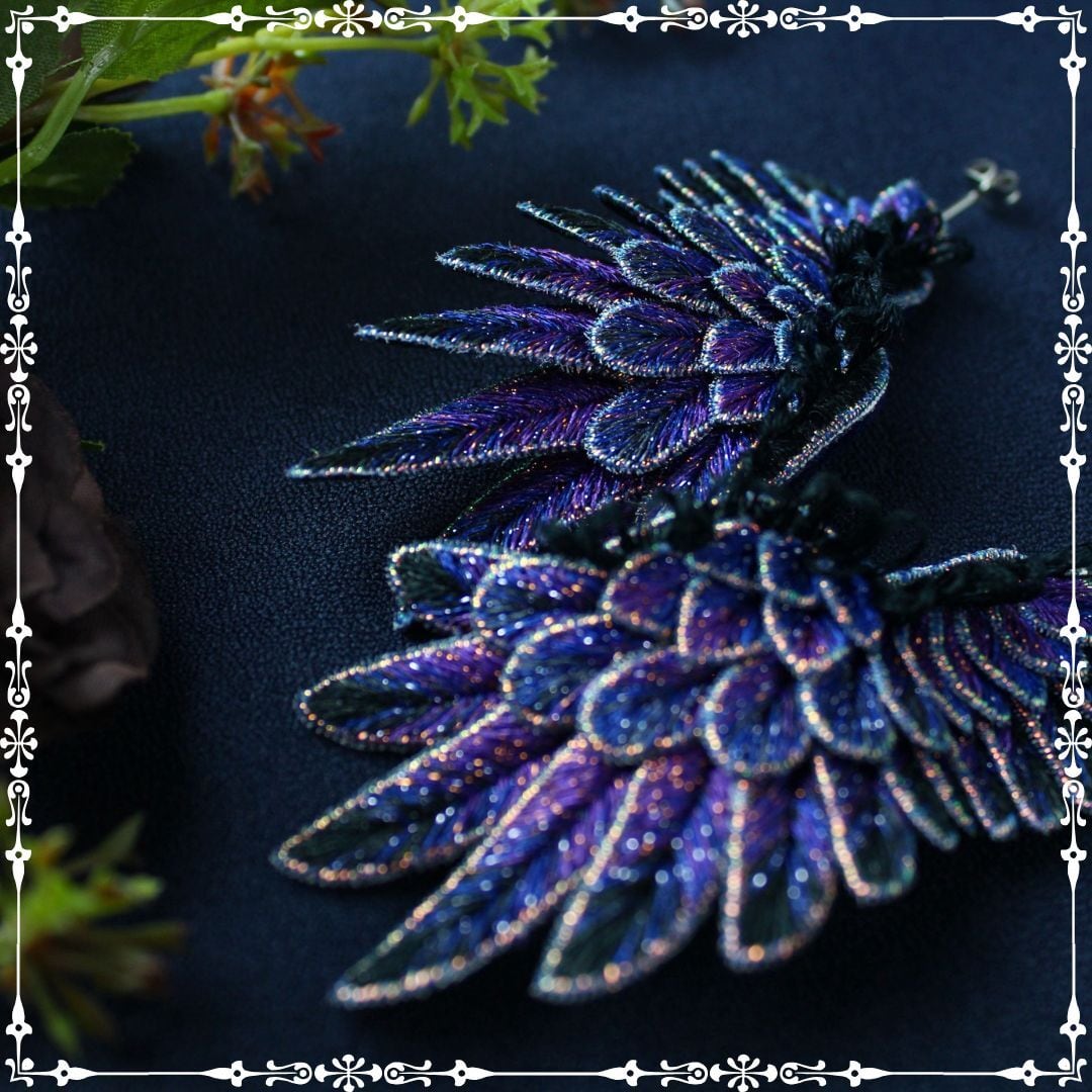 大嘴烏羽翼刺繡耳針/立體刺繡/鳥翼飾品/ハシブトガラスの翼の刺繍ピアス