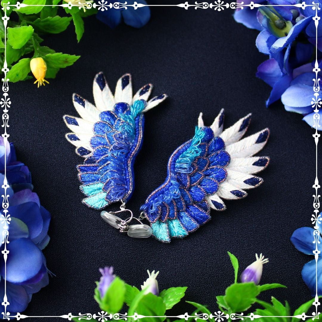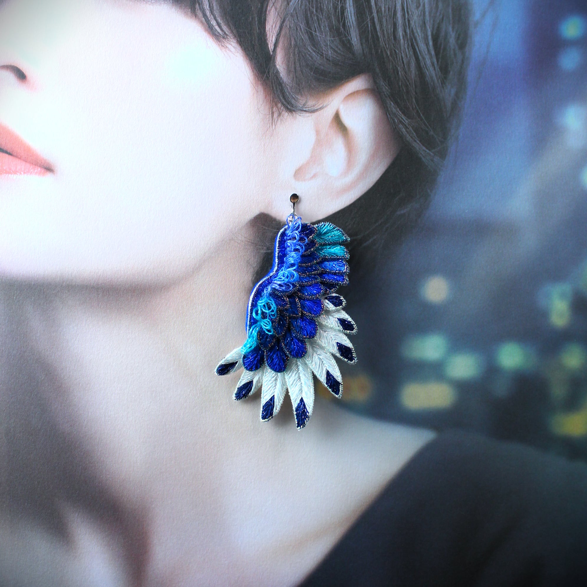 立体刺繍の技法を使い、色鮮やかな鳥の翼を耳飾りにしました。羽根一枚一枚を細いラメの輝く刺繍糸で作り、何枚も重ねて羽ばたく翼に仕上げています。