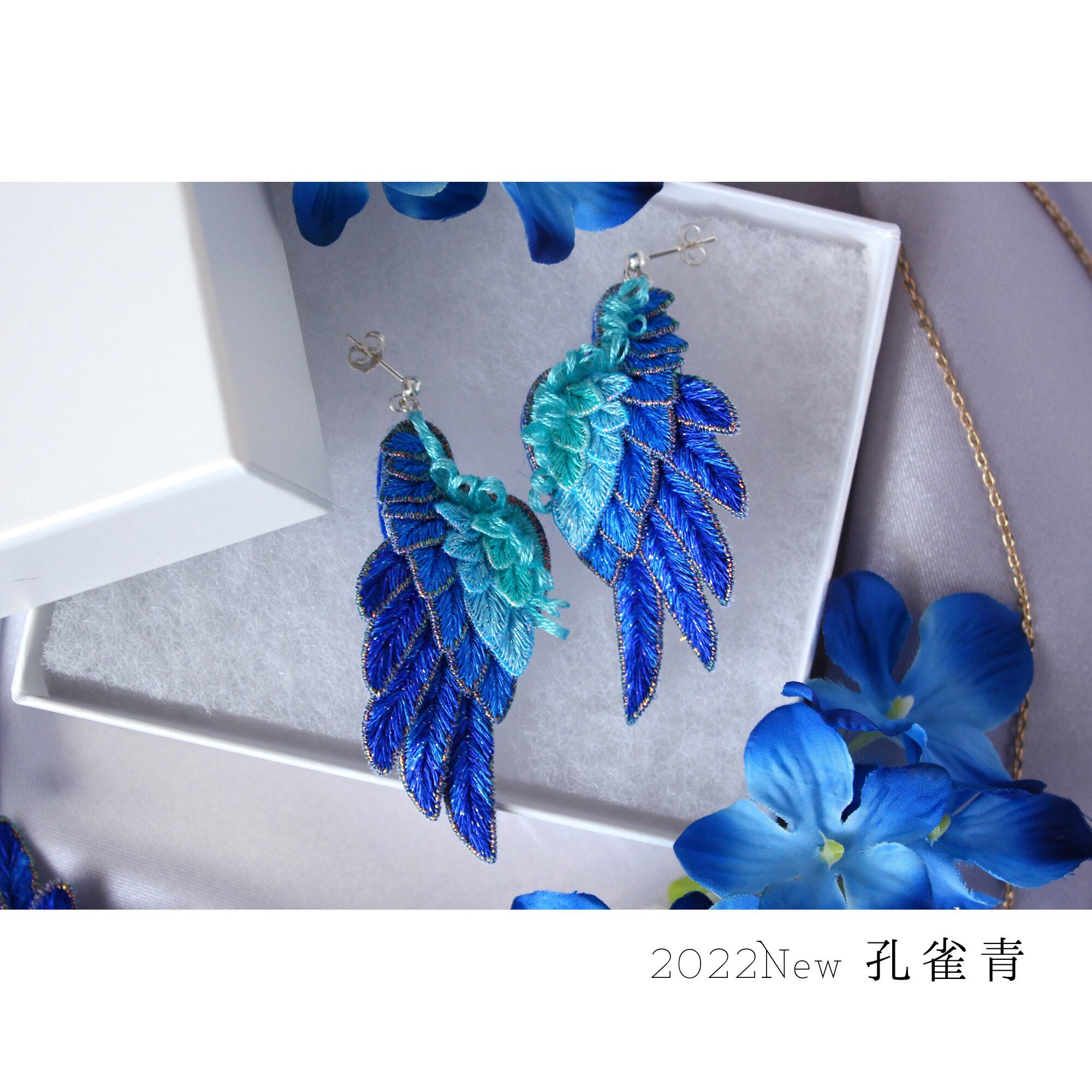 立体刺繍の技法を使い、色鮮やかな鳥の翼を耳飾りにしました。羽根一枚一枚を細いラメの輝く刺繍糸で作り、何枚も重ねて羽ばたく翼に仕上げています。通常サイズの翼と比べて一回り程小さくなっています。